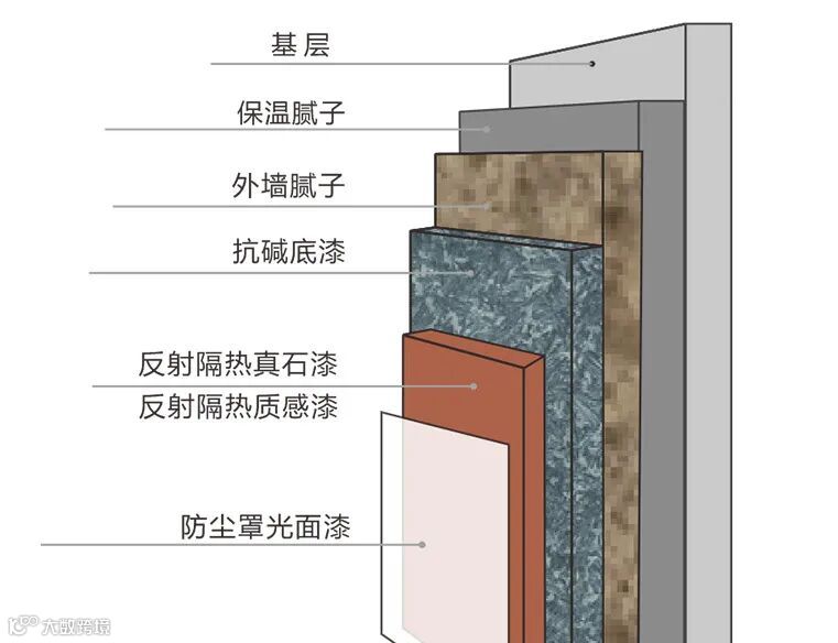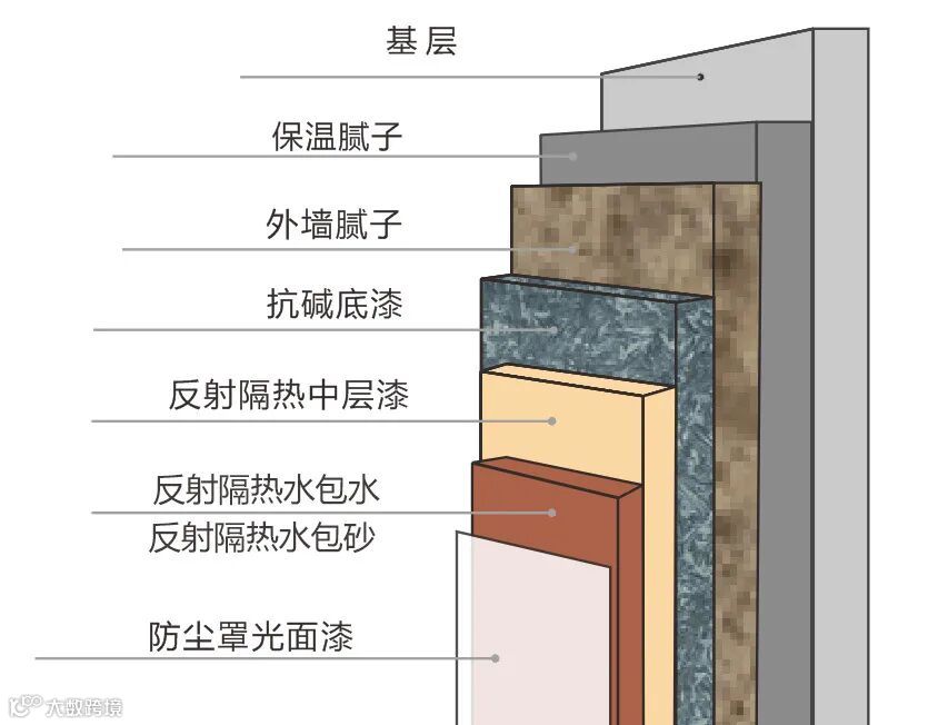 以硅改性丙烯酸乳液为成膜物质,搭配红外反射颜填料和纳米中空玻璃微珠等材料,通过水包水微胶化造粒工艺制成。它的涂层能反射阳光和紫外线,经久耐用,并且作为水性漆更加节能环保,不存在脱落风险。