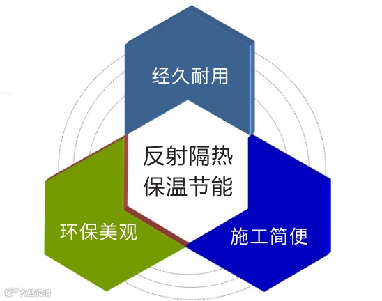 采用优异的红外反射隔热填料和特殊助剂为主要的反射隔热材料,极大地提高了太阳光反射比,并配以具有优异抗回粘性,防水性的丙烯酸酯类复合乳液,以及具有优良红外反射性能的冷颜料。当太阳光照射至涂层上,在太阳能还未转换成热能前就把红外线反射出去,从而达到节能的作用。