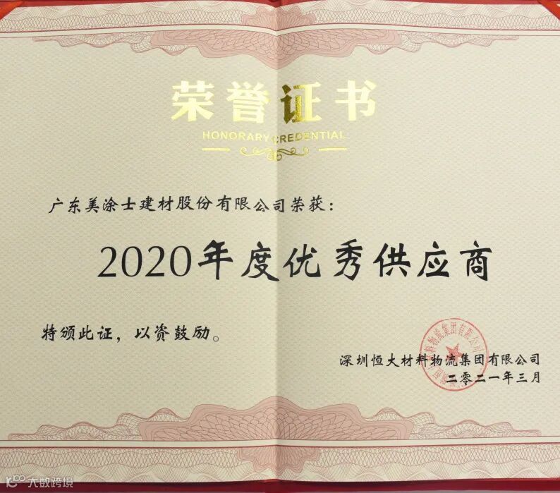 3月,作为多年合作紧密的伙伴企业,美涂士获得了恒大地产“2020年度优秀供应商”,这不仅仅是一份荣誉,更代表了十强地产大客户在过去的一年里,对美涂士工程服务的认可与赞赏。