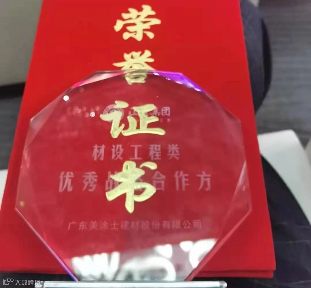 同月23日,与美涂士合作一年多的正黄集团也向我司颁发了“优秀合作供应商”以示嘉奖。仅一年时间,双方已合作近30万平米,相信在不久的将来,美涂士与正黄集团将会联手打造更多的精品优品。