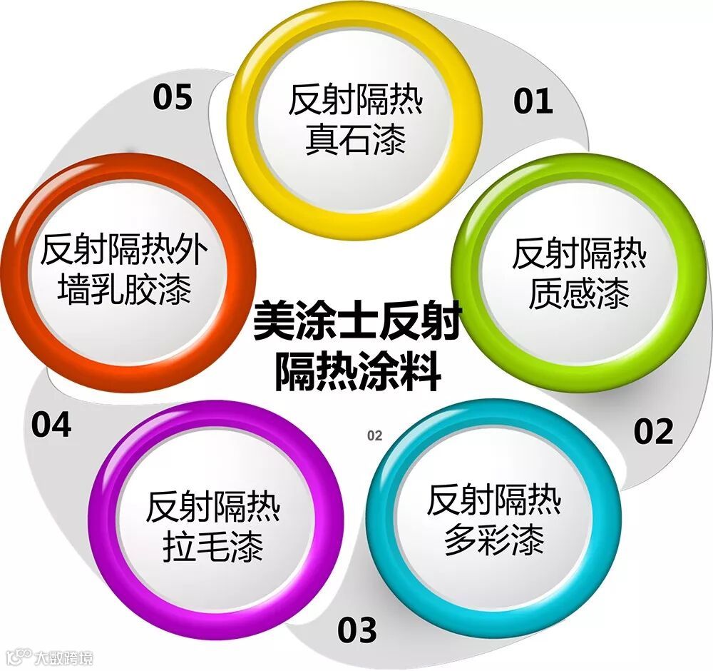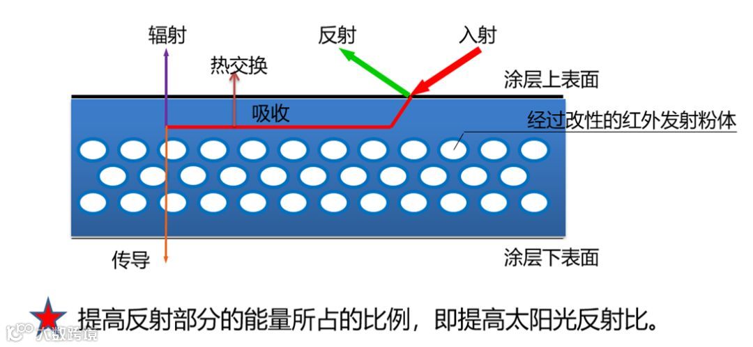 【反射】把物体表面的热量辐射到太空中去,降低物体的温度即使在阴天和夜晚涂料也能辐射热量降低温度,同时在涂料中放入导热系数极低的空心微珠隔绝热能的传递,即使在大气温度很高时也能隔住外部热量向物体内部传导,三大功效保证了涂刷涂料的物体降温,确保了物体内部空间能保持持久恒温的状态。