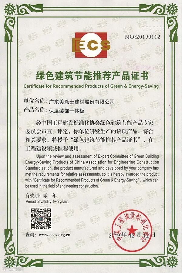 ●美涂士保温装饰一体板获绿色建筑节能推荐产品证书