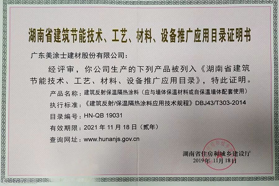 ●美涂士建筑反射保温隔热涂料被列入湖南省建筑节能技术、工艺、材料、设备推广应用目录证明书