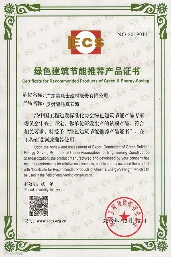 ●美涂士反射隔热真石漆获绿色建筑节能推荐产品证书