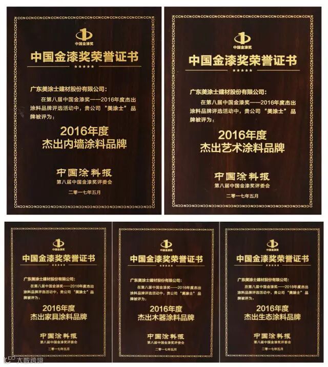 美涂士在这次的评选中,揽获“年度杰出内墙涂料”、“年度杰出木器涂料”、“年度杰出家具涂料”、“年度杰出艺术涂料”、“年度杰出生态涂料”等五项大奖,充分体现行业及消费者对美涂士品牌的认可与肯定。