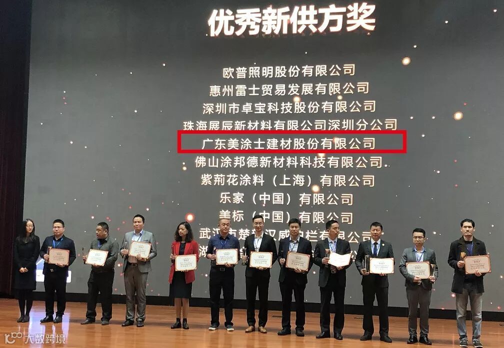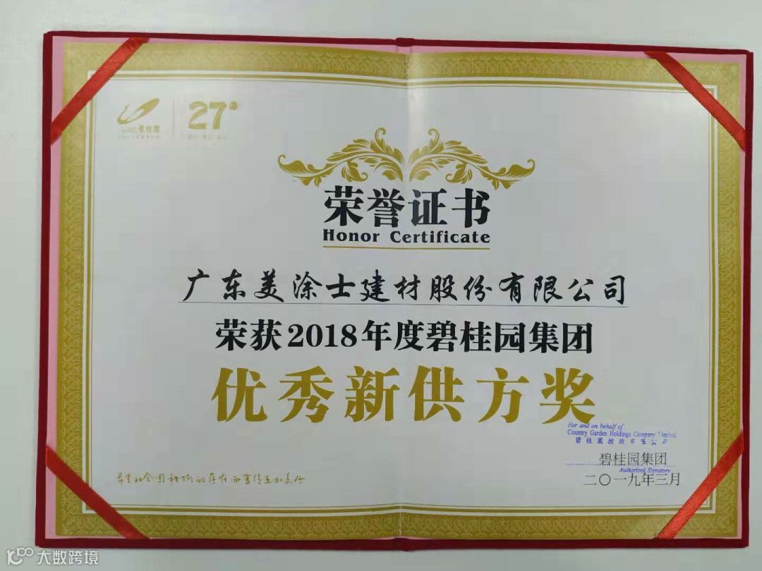2019年3月7日,碧桂园集团举行以“品质共建,通达共赢”为主题的2019年供应商大会,会上碧桂园集团为我司颁发2018年度碧桂园集团优秀供应商奖!以此表彰美涂士在产品供应能力和高效完善服务体系的突出表现。