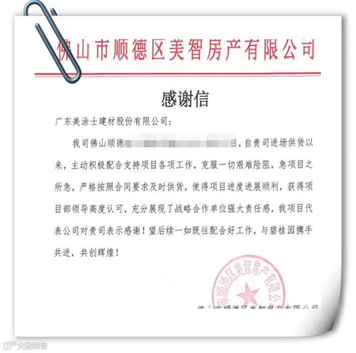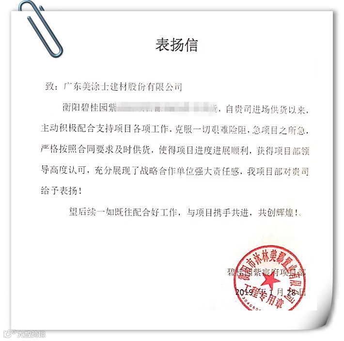 在与碧桂园集团的合作过程中,美涂士工程始终秉持着诚信友好的合作精神以及高度专业专注的服务态度,为碧桂园集团提供内外墙全系列产品,在佛肇区、湖南区等全国领域,共同打造了碧桂园滨江府、碧桂园水木清华等众多经典工程项目,用实例证明实力;正因此,美涂士可获得碧桂园集团颁发的优秀供应商奖项,而所合作的多个项目也收到碧桂园集团寄来的表扬信和感谢函。