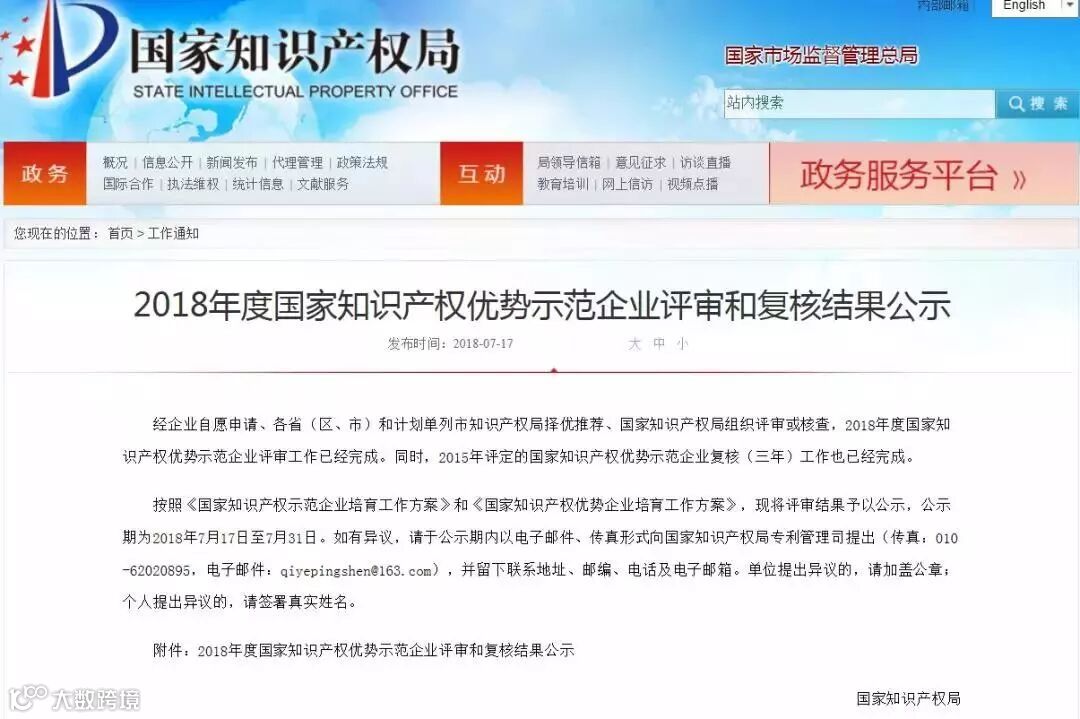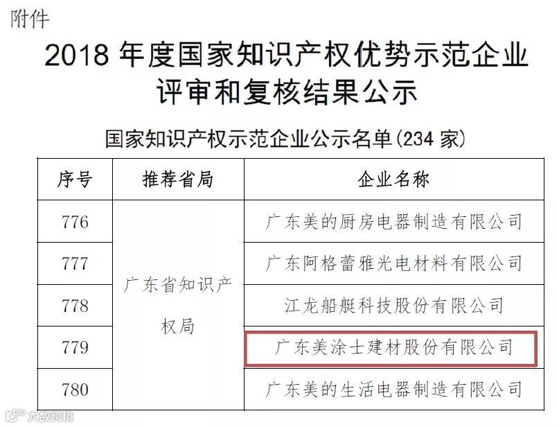 近日,国家知识产权局发布《2018年度国家知识产权优势示范企业评审和复核结果公示》,广东美涂士建材股份有限公司凭借优秀自主创新能力及知识产权优势荣登“国家知识产权优势企业”榜单。