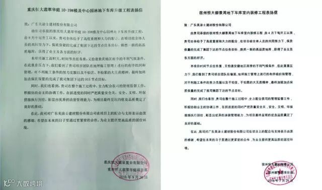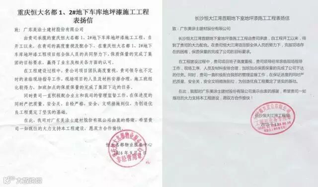 再好的产品,没有出色的工程技术和优秀的施工人员,也会陷入徒有其表的窘境。美涂士凭借20多年成功服务上万家大中型企业客户、国家重点形象工程、市政项目等施工管理经验,在服务各类地产客户尤其是核心战略合作伙伴恒大地产车库地坪升级改造项目中,应对工期紧、任务重、施工条件恶劣、天气因素干扰等多重困难,能圆满完成节点任务,以完美的车库效果获得了客户的高度认可,收获多封表扬信。这不仅仅是表扬信,更是对美涂士未来项目提出的更高要求,激励我们的团队为自己树立更高的标准。