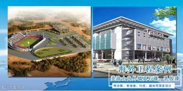 美涂士产品多年前已出口俄罗斯、德国、印度等60多个国家、地区。随着产品的出口,服务技术也随之出口,在世界各地承建了多项知名工程。