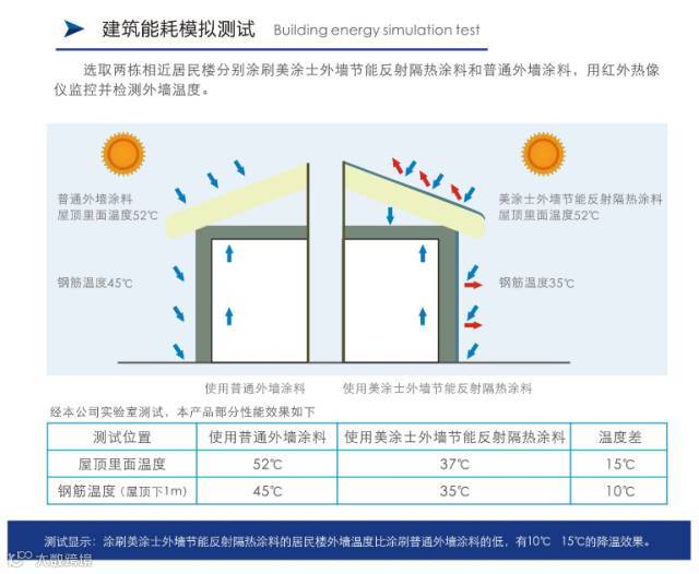 选取两栋相似居民楼分别涂刷美涂士外墙节能反射隔热涂料和普通外墙涂料,用红外热像仪监控并检测外墙温度。