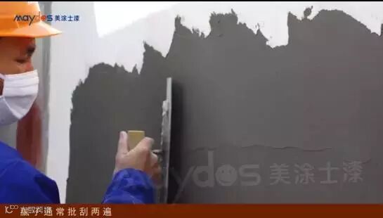 基层处理好之后开始批刮腻子。 柔性外墙弹性腻子采用进口高聚合物等配制而成,具有极佳的弹性。使用刮板或钢批从上向下薄薄地批刮腻子,第一道腻子干燥后,再批刮第二道腻子。待腻子完全干透后用砂纸打磨平整,清扫灰尘。