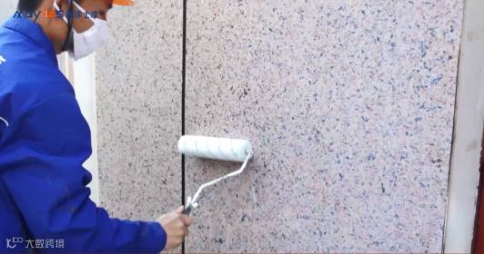 面漆施工一般采用喷涂方法,在干透的底漆面上薄薄地喷涂,从上向下均匀喷涂两遍,在面漆还没有表干前撕掉美纹纸即可。若施工平面仿石效果,按以上步骤施工后,再用收光批刀轻轻压实收光即好。喷涂时务必使涂层厚薄均匀,不露底,浮点大小基本一致。