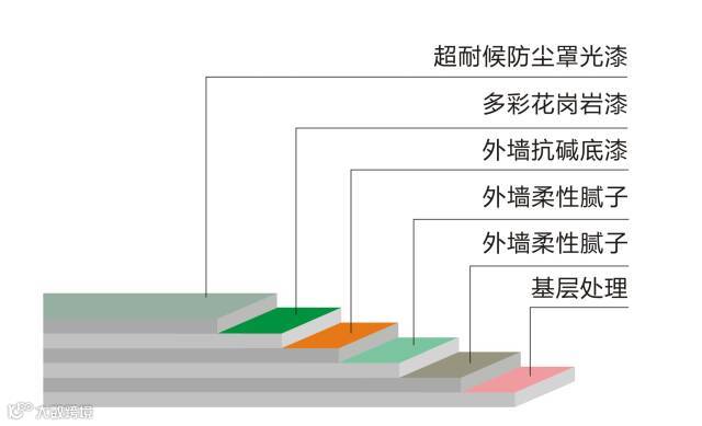 面漆层完全干透后,用无气喷枪均匀薄喷一遍罩光漆。超耐候防尘罩光漆具有超强耐候性,无惧外墙酸雨、紫外线损伤,附着力强。至此美涂士多彩花岗岩漆的全部施工程序完成。因多彩花岗岩漆具有较强韧性,一般的外墙施工,可不进行罩光施工。