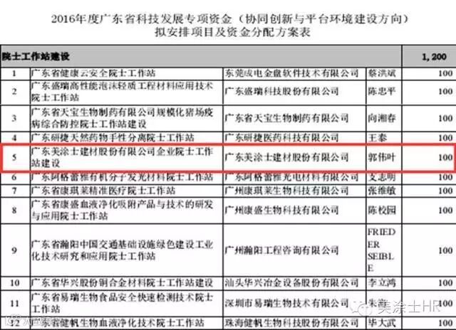 近日,经广东省科技厅、财政厅严格审查,广东美涂士建材股份有限公司获批设立“广东省院士工作站”,并且获得了100万元的项目财政经费奖励。将重点开展防水涂料项目的技术研发,这标志着美涂士将携手专家院士及省内的科技研发机构,联合打造企业高科技技术创新平台,推动公司在涂料行业的自助研发能力,实现产学深度融合,引领行业技术的快速发展。