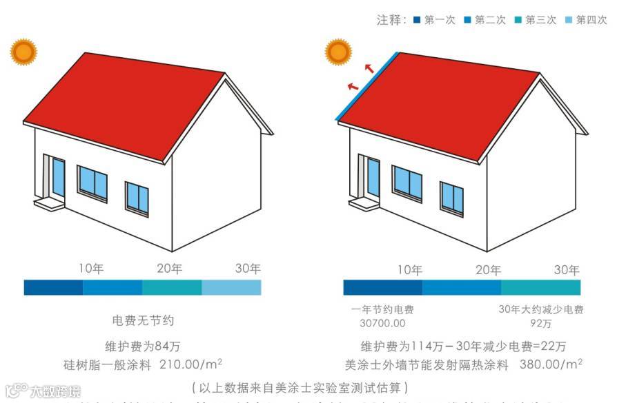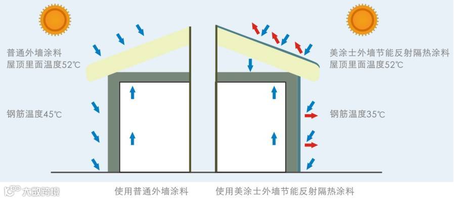 美涂士反射隔热涂料由液态高质量纯丙乳液、优异的反射隔热材料和具有卓越隔热效果的微孔隔热技术制成的一种弹性隔热表层涂料,具有良好的隔热、抗紫外线、抗老化及优良的耐候性、低温柔性,同时具有隔热和装饰、保护的功能。