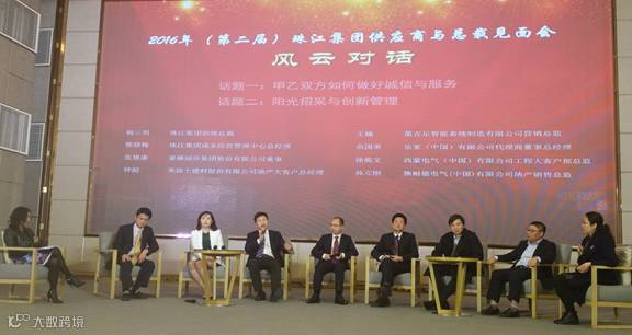 良好稳定的合作关系是保证供需双方长久共赢的重要条件之一。在大会的风云对话环节上,珠江投资集团成本经营管理中心副总经理吴彩萍作为嘉宾主持,开发商嘉宾代表珠江集团助理总裁杨三明、成本经营管理中心总经理熊晓梅与供应商们展开风云对话,美涂士地产大客户总经理钟超与蒙拉丽莎、施耐德电气、乐家(中国)等其它供应商品牌的代表共同探讨了“甲乙双方如何做好诚信与服务,阳光招采与创新管理”,从质量、价格、售后服务、付款和产品附加值,以及提升优化甲方管理流程等方面进行深入探讨,分析了长期稳定合作伙伴的重要性以及未来的合作发展方向,并现场接受所有与会供应商提问。