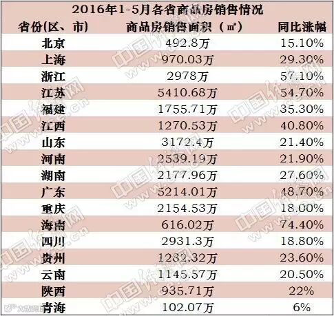 近日,浙江、江苏、广东、北京、上海等全国17个省(区、市)相继公布了今年1-5月商品房开发投资和销售情况。据中国经济网记者统计,已公开数据的省份基本保持着较高速度的销售增长,其中6个省份前5月商品房销售面积增幅超过全国整体水平,海南省增幅达74.4%,为全国最高。