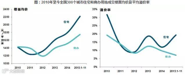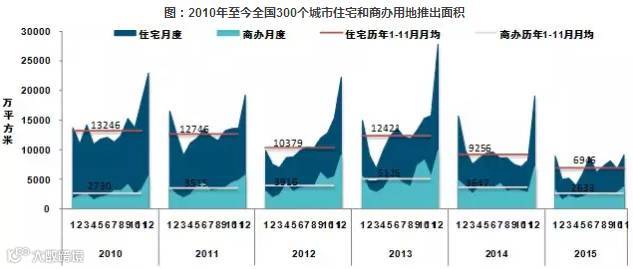 土地供需仍维持低位,下半年以来降幅收窄。供应方面,全国各类土地推出量仍旧保持低位,但在年底逐渐企稳回升。2015年1-11月,全国300城市共推出各类用地17.3亿平方米,同比下降19.1%,降幅较前三季度收窄8.9个百分点。今年全国300城市土地供应仍处于较低水平,土地推出量上半年同比下降,下半年降幅逐渐收窄,并在10-11月转跌为涨,同比上涨15%,土地市场逐渐企稳。成交方面,各类土地成交量同比下降21.7%,降幅收窄,但仍大于推出量。2015年1-11月,全国300个城市各类土地共成交13.2亿平方米,同比下降21.7%,大于推出量降幅;各类土地成交出让金1.8万亿元,同比减少12.7%。目前,房企整体经营策略保持谨慎,但随着销售形势好转,企业对部分城市拿地热情升温,土地市场逐步企稳回升。