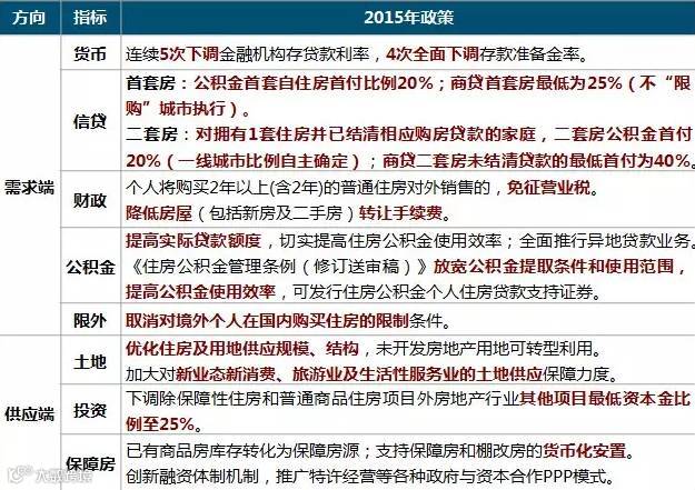 2015年房地产政策坚持促消费、去库存的总基调,供需两端宽松政策频出促进市场量价稳步回升,行业运行的政策环境显著改善。从需求端来看,中央多轮降准降息、降首付、减免税费等降低购房成本,推动需求入市;地方政策灵活调整,采取税费减免、财政补贴、取消限购限外等多措施刺激消费。从供应端来看,土地供应控规模、调结构,并加大保障性住房货币化安置,改善市场环境。