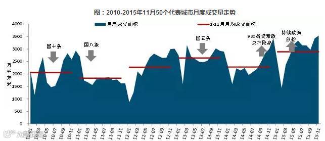 新房方面,政策刺激下市场快速升温,成交创历史同期新高。据初步统计,2015年1-11月,50个代表城市住宅月均成交接近2900万平方米,同比增长近三成,绝对量为历史同期最高水平。值得注意的是,11月,代表城市住宅成交在3500万平方米左右,超过去年12月单月水平,创单月成交新高。二手房方面,整体成交大幅回暖。1-11月,十大城市二手住宅总体成交99.04万套,同比大幅增长66.02%,增幅高于新房。二手房市场表现整体好于新房市场,深圳、上海、北京已经步入存量房时代。