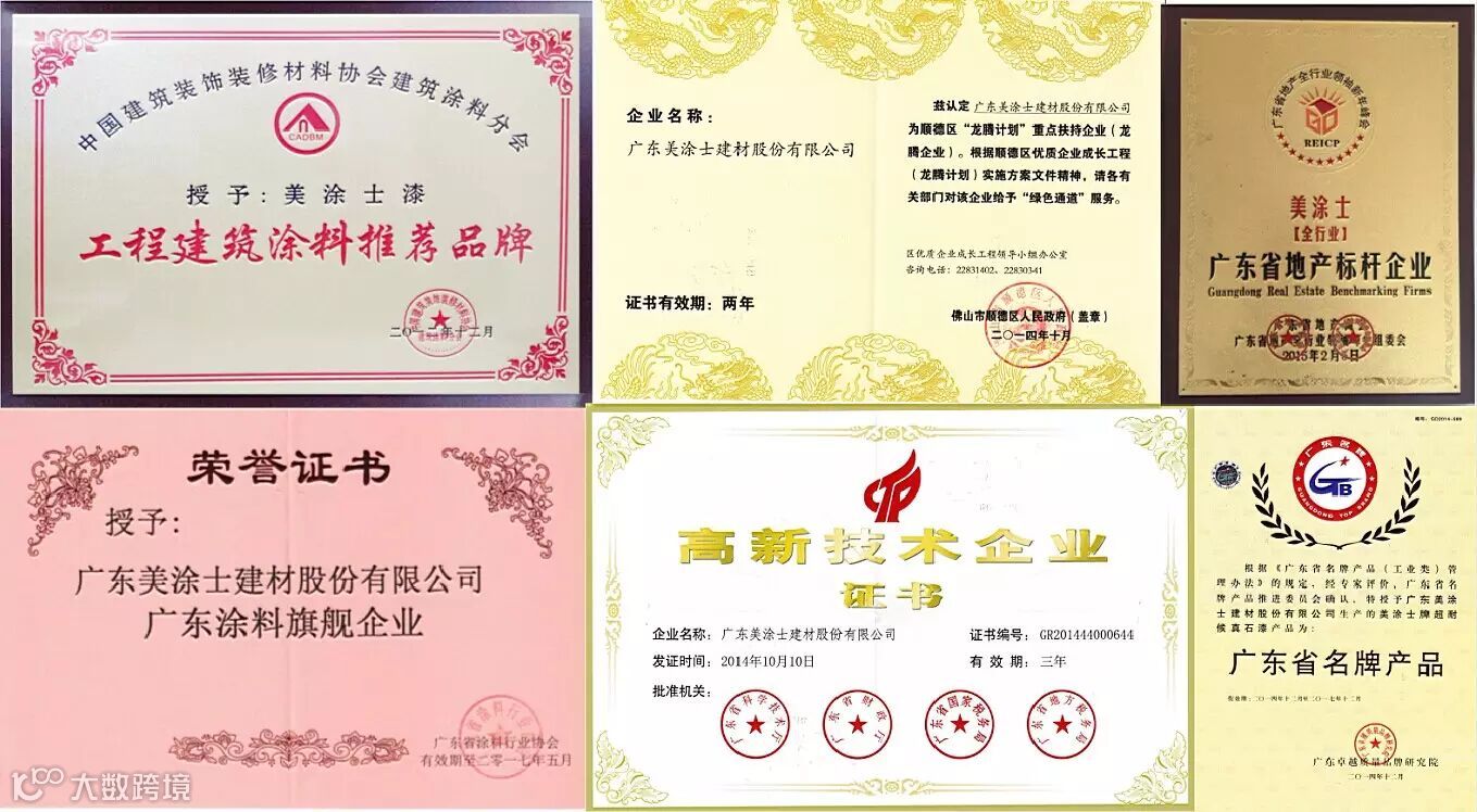 20年来,美涂士荣获:广东省地产全行业标杆企业、广东省民名牌产品、工程建筑涂料推荐品牌、广东涂料期间企业、国家高新技术企业、“龙腾计划”重点扶持企业等荣誉,荣誉是对品质最好的肯定。