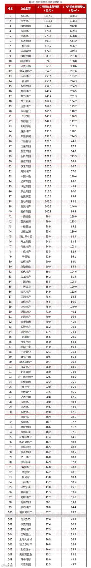 排名第三的绿地1-7月销售业绩超过900亿元,预计下个月将第三个突破千亿,千亿军团依然稳定。