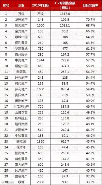 2015年1-7月30家典型房企全年销售目标完成情况(亿元)