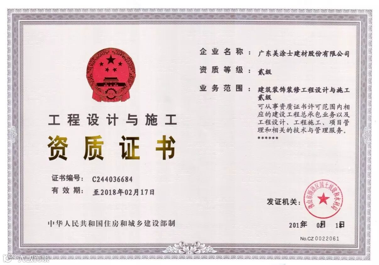 美涂士公司获得建筑装饰装修工程设计与施工二级资质,拥有承接重大工程项目的能力和资质,这在行业内可谓凤毛麟角。