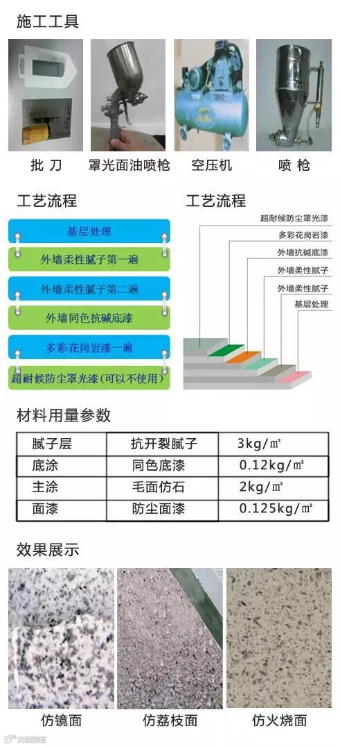 作为最具仿真效果的石漆产品,多彩花岗岩漆的施工工艺如下: