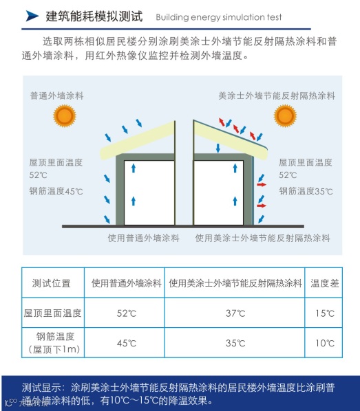 除了真石漆之外,近年来备受工程商追捧的美涂士美涂士外墙节能反射隔热涂料更是涂料行业节能环保的佼佼者,其主要由最新聚合技术合成的特殊结构改性丙烯酸乳液与具有卓越隔热效果的空心微球配置而成,具有优异热反射系数和半球反射率,为居者创造健康、节能居住空间的同时,还具有耐沾污性、耐候性、防水透气性,为墙面带来全方位保护。