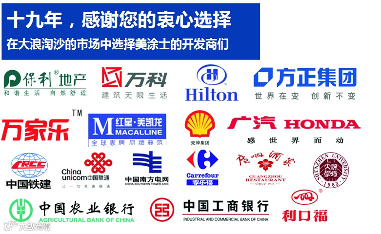 作为专注地产建筑领域墙面装饰与保护的专业服务商,美涂士工程中心以其优良的产品品质和专业的服务质量,相继被上海国家会展中心、青藏铁路、北京人民大会堂、第29届奥运会青岛国际帆船比赛中心、广州新白云国际机场、珠海拱北海关大楼、山东泉城广场、海南博鳌会场、上海世博会展厅、深圳地铁等全国2500多个知名工程采用。