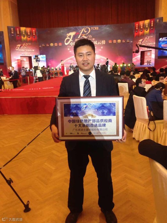 在本次风云榜上,经过各方面评选,成功摘得“中国绿色地产部品供应商十大采购首选品牌”,广东美涂士建材股份有限公司大客户事业部总经理钟超出席本次会议,与各房地产行业领袖共话发展。