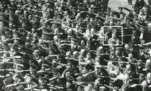 1936年汉堡,船厂工人们在观看纳粹海军训练舰下水仪式。在向纳粹致敬的人海中,只有这名男子拒绝举手。此前,因为和一位犹太女人结婚,他已被判两年苦力。二战中失踪。1949年被宣布死亡。1991年这张照片刊登时,一名女子认出这是她的父亲,这个男人的名字叫August Landmesser。