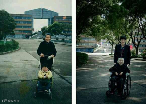20年前,宁波大学南天门教学楼前,奶奶推着婴儿车里的孙子;20年后,孙子推着轮椅上89岁的奶奶:“南天门被繁枝茂叶挡住了,二十年匆匆别过,我们都长大了,您却老了。”
