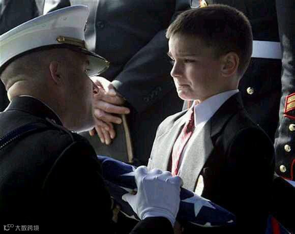 一个8岁的小男孩在父亲的葬礼上接过了国旗,父亲在伊拉克战争中阵亡。