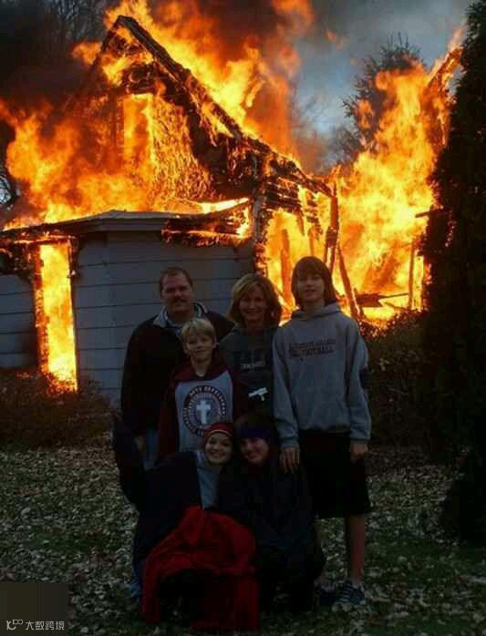 一家人与自己熊熊燃烧的房子最后一张合影。失火时,全家人安全跑了出来,火势太大,已经救不了。看到这样的充满正能量的笑容,生活中还会有负能量影响到你吗?