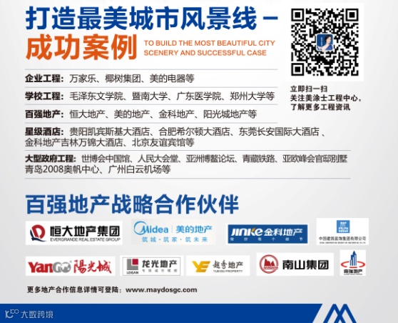 自进军工程涂料市场以来,美涂士漆不断缔造辉煌,陆续与恒大地产、美的地产、金科地产、阳光地产等地产龙头企业成为战略合作伙伴。