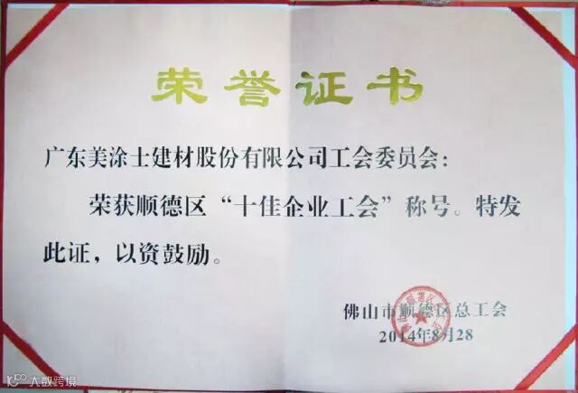 此次荣获“十佳企业工会”荣誉称号,是对美涂士公司一直以来贯彻“员工为本”工作的充分肯定。为鼓励并树立美涂士这一先进典型,顺德区工会将“十佳工会之友”这一荣誉颁给了集团董事长周伟建。这是对周董事长深入落实“关爱员工、深入关切员工问题和困难,为员工排忧解难,真正为员工谋福利”的长期政策的肯定。这两项荣誉的获得,对进一步促进美涂士构建和谐企业、实现又好又快发展具有重要的意义。