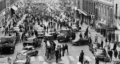 1967年9月3日,瑞典将道路通行方向由靠左改为靠右后的第一天。