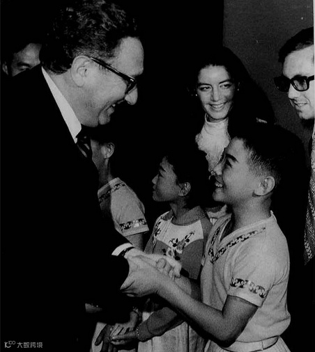 1974年,中国武术代表团访美,基辛格与少年李连杰握手。