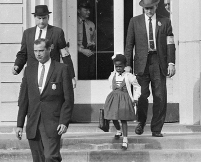 1960年,美国南方第一个进入白人小学的非裔美国人Ruby Bridges。好多保镖。