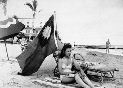 1941年12月15日,珍珠港事件后一周,迈阿密的海滩上,一家中餐馆的女招待Ruth Lee在身边插上了中华民国的国旗,以免被认作日本人。