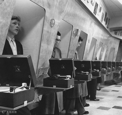 1955年,伦敦唱片店里顾客在隔音隔间里试听唱片。好高端的样子。