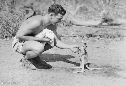 1942年,一名美国士兵与宠物袋鼠在西南太平洋战区同盟军基地。