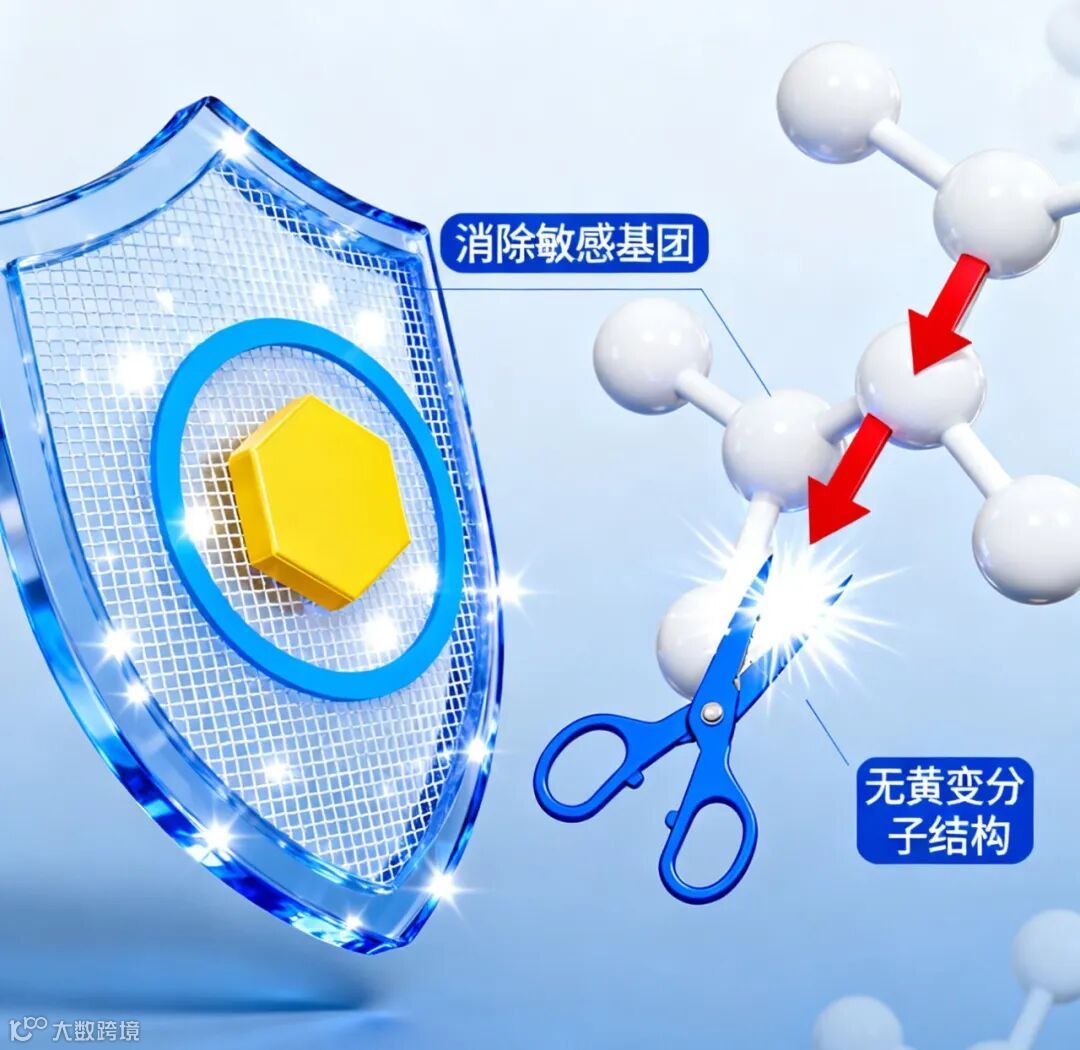 无黄变分子结构,切断老化链式反应,阻止黄变启动。