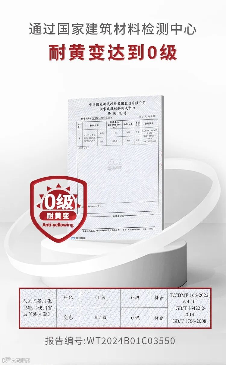 权威背书更踏实,珀盾美缝系列产品通过了T/CBMF166-2022《室内装饰装修用美缝剂》的测试,达到0级耐黄变标准,浅色不怯场,长久守护家居美感。