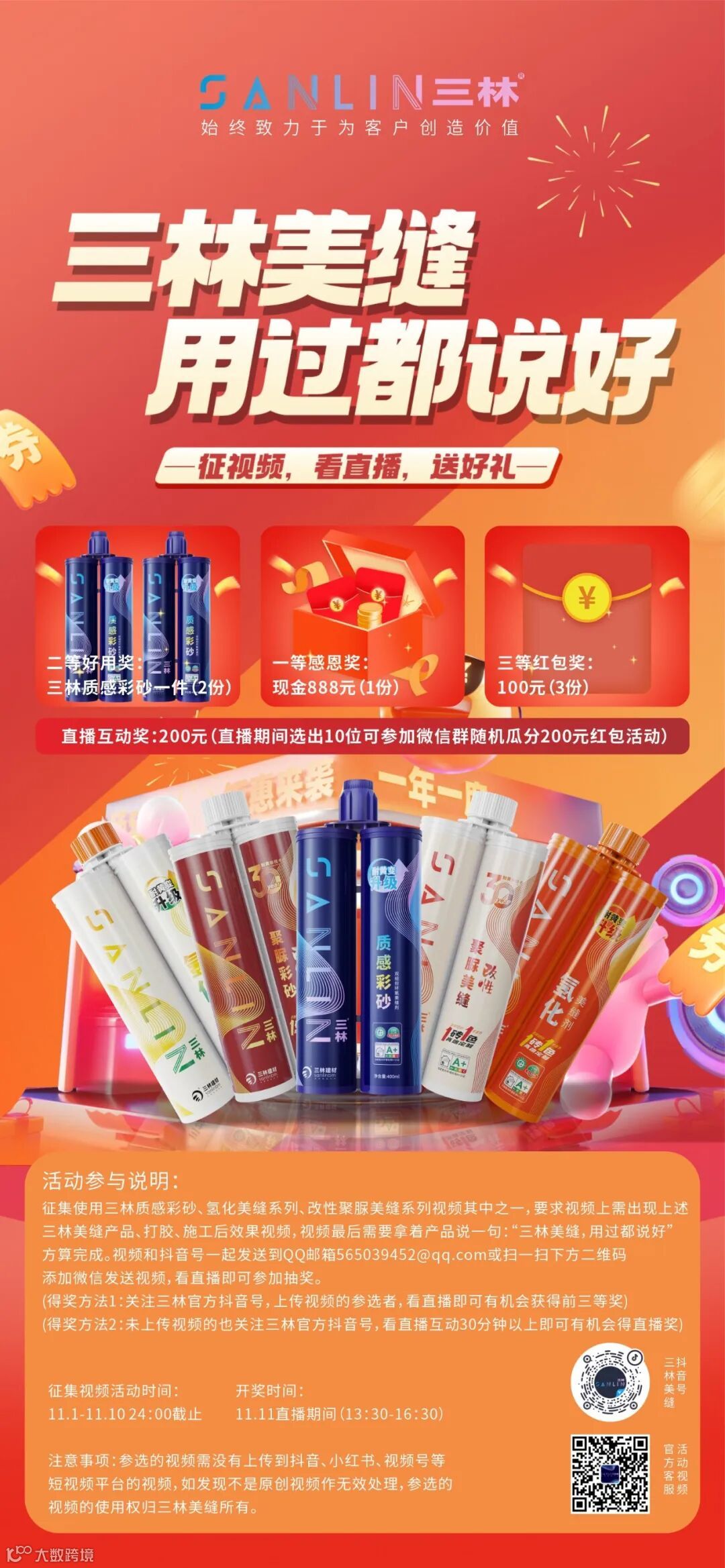 你是否已经体验过三林质感彩砂、氢化美缝系列或改性聚脲美缝系列的魅力?现在,拿起你的手机,记录下你打胶、施工的过程,以及施工后的完美效果。记得在视频最后,拿着产品说一句:“三林美缝,用过都说好”!