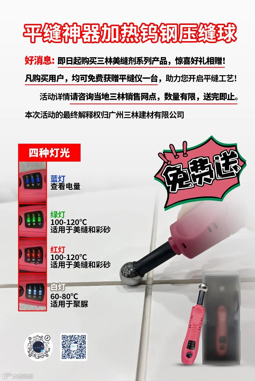 从现在起,只要购买三林美缝剂系列产品,我们就免费送你一台平缝仪!这可不是普通工具,它堪称美缝小白的 “救星”。不用研究复杂的操作技巧,也无需反复练习,只需将美缝剂填好后,拿起平缝仪,打开开关,简单三步 —— 预热、轻推、收尾,就能收获线条笔直、表面平滑的专业级平缝效果。哪怕你是第一次接触美缝,对照着简明易懂的视频教程,10分钟内也能快速上手。