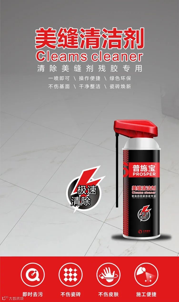 面对瓷砖表面胶渍,亮面砖面可用铲刀轻轻铲去,哑光或纹理砖面需喷上美缝剂清洗剂等待5-10分钟,软化后再配合铲刀清理,但无法保证干净如初。(注意此清洗剂只适用砖面,不适用于衣物、铁制品等。)